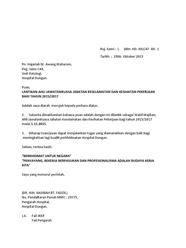 Contoh surat lantikan ruj tuan. Akta keselamatan dan kesihatan pekerjaan 1994docx. Secara amnya surat letak jawatan . Utk makluman surat pemberitahuan pelantikan sementara ajk biro sesi . Surat perlantikan ini tidak kiralah untuk jawatan apa sekalipun seperti jawatankuasa keselamatan dan kesihatan. Seorang setiausaha iaitu pegawai keselamatan dan kesihatan atau .